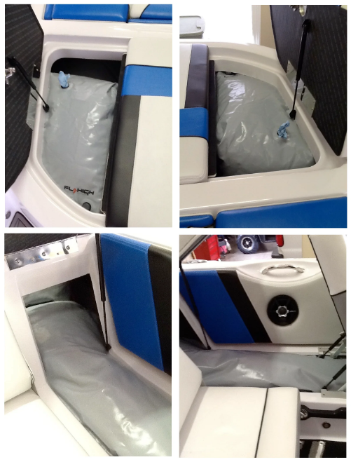 The body of the Enzo Surf sac is designed to fill the rear locker and the leg continues under the rear seat bulkhead which stretches forward under the side passenger bench. When filled to capacity the Enzo surf sac can add between 1000lbs and 1400lbs of water ballast on the surf side creating a monster wave with amazing push throughout the total length of the pocket.