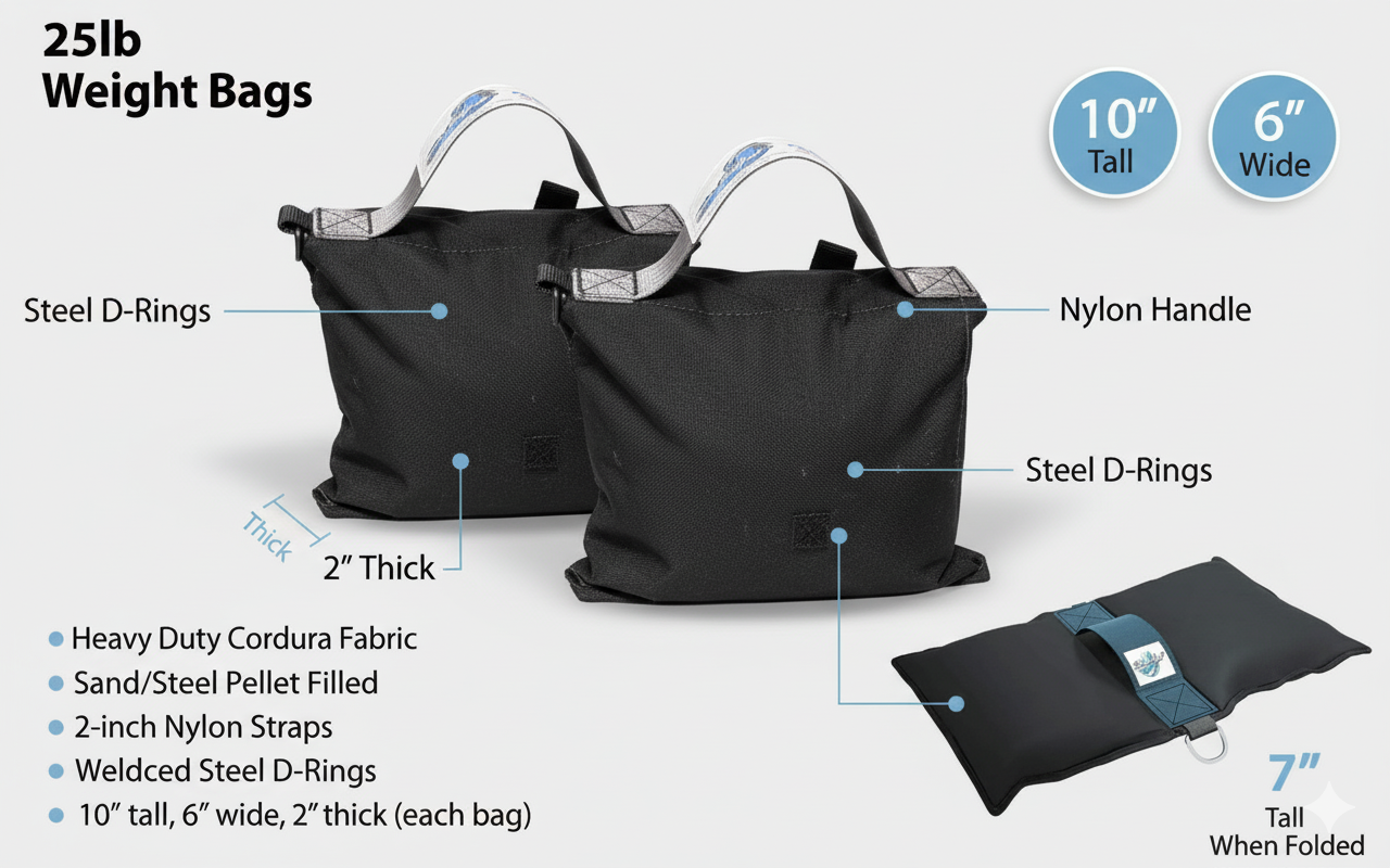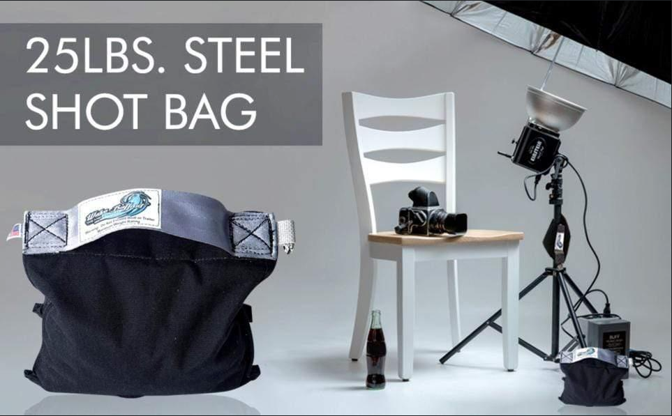 Our 25 LB Wake Ballast Bags are made from the highest quality 1680 D Ballistic Nylon. Our custom double stitching on all seams adds to the long life and durability. Our custom designed small steel shot allow our Wake Ballast Bags to conform to many shapes, corners for a perfect fit. The D Ring can hold the entire bag and is big enough to clip to any carabiner, tripod, or stand. The velcro strap on the bottom ensures your bags stay in place and won't move your set.